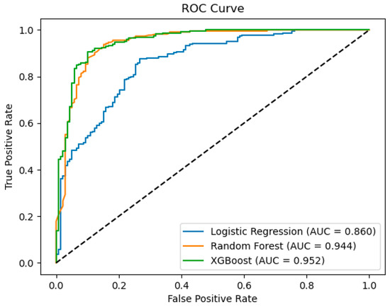 Table 6 reveals that among the machine learning models assessed, the XGB model outperforms LR and RF in terms of accuracy and recall. This advantage primarily stems from how RF and XGB handle the lagged effects of temperature, unlike LR, which omits the average maximum temperature during the fire-prevention period from its training due to variable collinearity. Consequently, XGB leads in predictive effectiveness, followed by RF. Since metrics like accuracy and recall are influenced by classification thresholds, additional model assessment is undertaken through ROC curve analysis. This analysis uses fire occurrence (0/1) as the state variable and fire-risk probability as the test variable, yielding AUC values of 0.860 for LR, 0.944 for RF, and 0.952 for XGB, which indicate well-fitting models. As illustrated in Figure 10, all three models perform commendably with AUC values above 0.8, with XGB ranking highest in predictive precision. The diminished effectiveness of the LR model is linked to lesser linearity between predictor datasets and wildfire occurrences, making it less effective than RF and XGB. The superior generalization of the XGB model over LR and RF is notable, though it is important to recognize that a high predicted wildfire probability by the RF model does not always correlate with actual fires, as the training and validation datasets include non-fire instances rated as high risk. Despite this, the high accuracy of the XGB model in predicting real fire events highlights its utility in forecasting wildfire probabilities, demonstrating robust predictive capabilities [6].