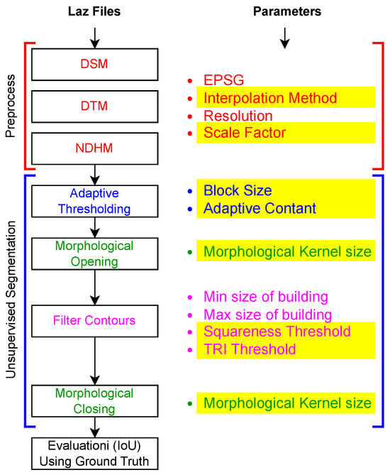 Due to the diverse features of LiDAR data from different sources, this work selects adaptive thresholding for generalization. However, filter contours and morphological opening and closing are employed to remove false positives and improve the resultant irregular segmentation from thresholding [18]. False positive contours are identified using the terrain ruggedness index (TRI) with the help of filter contouring [19]. In contrast, determining an optimal parameter value for these four operations still remains challenging, as it depends on various factors, such as the characteristics of the LiDAR data, the complexity of the urban environment, and the size and shape of buildings. In recent years, evolutionary approaches such as genetic algorithms (GAs) have been extensively employed in many problems for optimization purposes [20,21,22]. This paper also utilizes optimization techniques such as GAs, which have been employed to automatically tune the parameters and improve the accuracy of building segmentation [23].