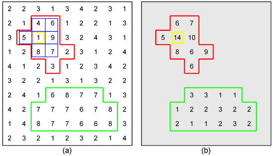 TRI explanation: each DSM has a red and green contour. (a) DSM before applying Equation (2). Blue serves as a 3 × 3 kernel for contour filtering for yellow 1, as shown in example (a). (b) DSM after contour filtering. The red contour’s average value, which is TRI, is greater (not building) than the green contour (building).