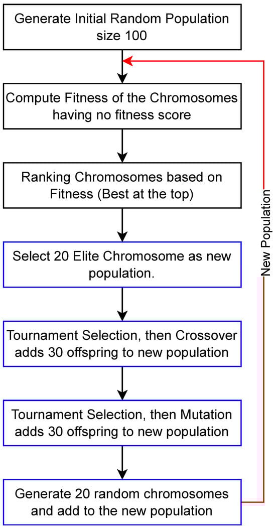 Figure 3 illustrates the flow diagram of the genetic algorithm. The process begins with the generation of a random initial population for the upcoming generation loop of GA. Inside the generation, this population serves as the current population. In the second step, the fitness score of each individual in the population is calculated using the fitness function explained in Figure 1. In the third step, the population is ranked based on these fitness scores, with the best chromosomes placed at the top. The fourth step involves passing the best 20 chromosomes to the new population, which serve in the next generation of the GA. In steps five and six, better individuals are selected, followed by crossover and mutation operations, and the offspring of these operations are added to the new population. The final step generates the remaining 20 chromosomes to complete a new population of 100 for the next generation. The final step generates the remaining 20 chromosomes to enhance exploration within the GA and complete the total of 100 chromosomes for the next generation. The algorithm is designed to operate with 100 chromosomes per generation and accumulates 100 chromosomes as the new population for the subsequent generation.