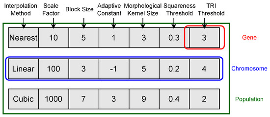 Table 1 lists the optimization parameters mentioned in Figure 1 with suitable ranges as a space search for the GA. Interpolation and scale factors belong to the preprocessing step, and the remaining five parameters are block size, adaptive constant, morphological kernel, squareness threshold, and min threshold for height and width of the contours belonging to the four segmentation steps in Figure 1. Interpolation could be nearest, cubic, or linear, while scale factor is any number from a set of positive real numbers to improve pixel contrast. Block size could be an odd number in the given range. The adaptive constant should be a positive or negative number. The morphological kernel selected in the given range would be used in the morphological opening before the filter contour and morphological closing after the filter contour. The squareness threshold is a float value that shows the minimum squareness of the building that is identified. The last parameter shows the minimum threshold value for the contour in pixels. Contours having a width or height less than the threshold value would be removed.