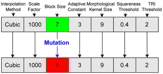 A mutation is a genetic operator used in GAs to introduce variations in the genes of individuals within a population. The purpose of mutation is to maintain genetic diversity and explore new areas of the solution space that may not be reachable through crossover alone. The tournament selection procedure is employed to select parents from the current population for mutation. Figure 6 represents the mutation operator, in which a selected parent goes through mutation. In the mutation process, a gene is randomly selected (green) and changed according to the parameter range (red) mentioned in Table 1 for exploration. In the given example, the block size gene is randomly selected and changed to another odd value according to the block size range rather than any random number. In the case of the interpolation method, if selected for mutation, the value should be changed from cubic to linear or nearest.