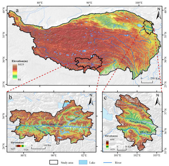 The YZR area (Figure 1a,b) is situated in the southern part of the Qinghai-Tibet Plateau. It primarily encompasses the middle reaches of the Yarlung Zangbo, Lhasa, and Nianchu Rivers, with a total area of approximately 66,500 km2. This region belongs to the mountain plain broad-valley area, which is characterized by wide and gentle river floodplains, alluvial terraces, and alluvial fans along riverbanks, as well as a few gorges.