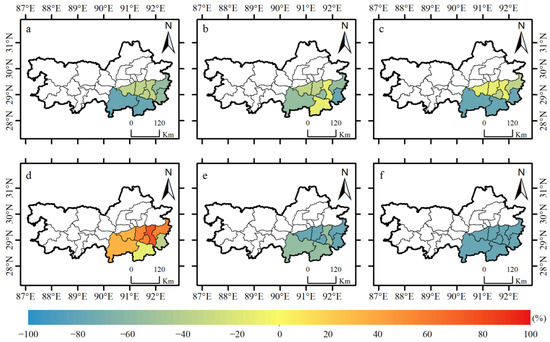 Illustration of the relative area difference (%) between the cropland distribution data products and statistical data in the YZR area. (a) WC (10 m), (b) LC (10 m), (c) AIEC (10 m), (d) GL (30 m), (e) GLC (30 m), and (f) CLCD (30 m).