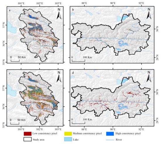 Spatial consistency among overlay results: (a) 10 m cropland distribution data in the Hehuang Valley area, (b) 10 m cropland distribution data in the YZR area, (c) 30 m cropland distribution data in the Hehuang Valley area, and (d) 30 m cropland distribution data in the YZR area.