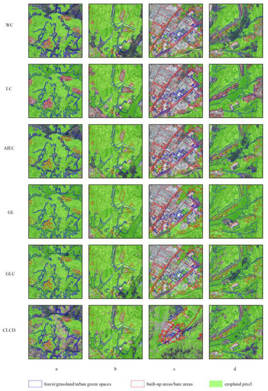 Details of cultivated land data in the Hehuang Valley. (a) Slope cropland, (b) areas with concentrated cropland distribution, (c) urban green spaces, and (d) areas with a mixture of cropland and other land types. WC (10 m), LC (10 m), AIEC (10 m), GL (30 m), GLC (30 m), and CLCD (30 m). Note: The process of manual visual interpretation primarily relies on sub-meter resolution remote sensing imagery, supplemented by auxiliary data, such as DEM data, ground survey samples, and other cropland distribution data. In this context, the primary focus is on the misclassification of cropland. Therefore, forest, grassland, and urban green spaces were categorized as a single class, while built-up areas and bare areas were grouped into another class.