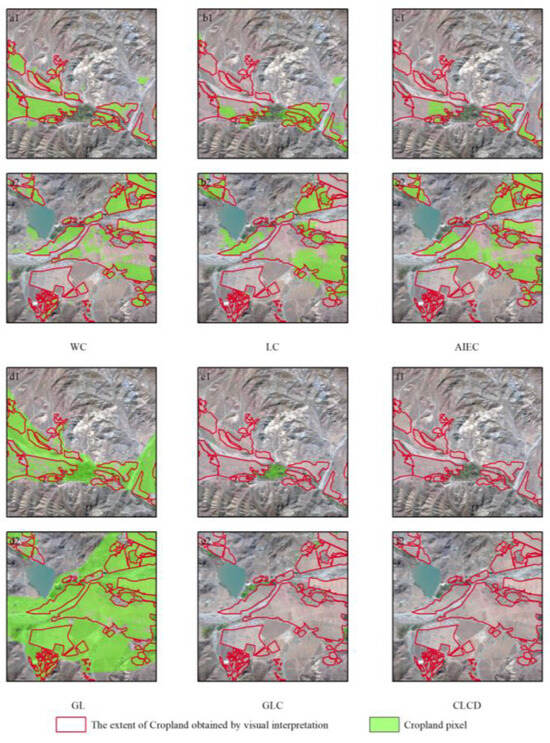 Details of cultivated land data in the YZR area. (a1,a2) WC (10 m), (b1,b2) LC (10 m), (c1,c2) AIEC (10 m), (d1,d2) GL (30 m), (e1,e2) GLC (30 m), and (f1,f2) CLCD (30 m). Note: The process of manual visual interpretation primarily relies on sub-meter resolution remote sensing imagery, supplemented by auxiliary data, such as DEM data, ground survey samples, and other cropland distribution data. In this case, the focus is on the omission of cultivated land. Consequently, only the cropland category was interpreted.