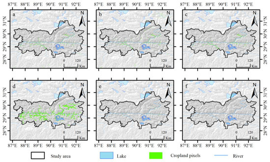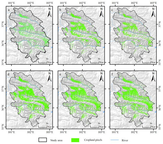 Pixel distribution of cropland distribution data in the Hehuang Valley. (a) WC (10 m), (b) LC (10 m), (c) AIEC (10 m), (d) GL (30 m), (e) GLC (30 m), and (f) CLCD (30 m).