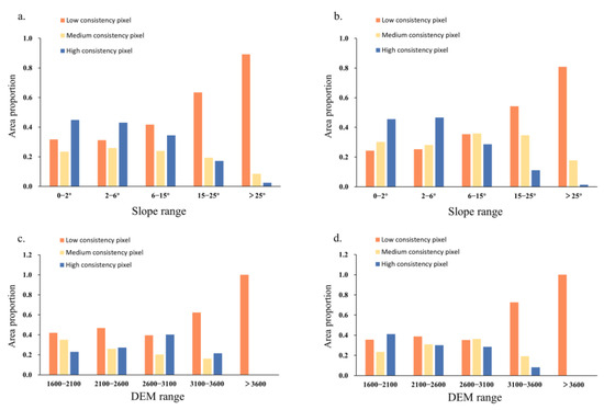 Area proportion of pixels with different consistencies in different terrain factor ranges in the Hehuang Valley region. (a) Proportion of consistent pixels among the 10 m cropland distribution data products at different slope ranges. (b) Proportion of consistent pixels among the 30 m cropland distribution data products at different slope ranges. (c) Proportion of consistent pixels among the 10 m cropland distribution data products at different elevation ranges. (d) Proportion of consistent pixels among the 30 m cropland distribution data products at different elevation ranges.