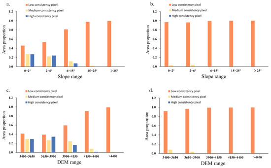 However, an analysis of the proportion of overlapping cropland data at different elevations (Figure 10c,d and Figure 11c,d) revealed that in the Hehuang Valley area, for the 10 m resolution overlapping results, the proportion of high-consistency pixels initially decreased, and the proportion of low-consistency pixels increased with the increasing elevation. However, within the elevation range of 2600–3100 m, the proportion of high-consistency pixels increased, and the proportion of low-consistency pixels decreased. For the 30 m resolution overlapping results, although less pronounced, the proportion of low-consistency pixels also decreased within the 2600–3100 m elevation range, whereas the proportion of medium-consistency pixels increased, and high-consistency pixels only slightly decreased. A similar phenomenon was observed in the YZR area. For the 10 m resolution overlapping results, within the elevation range of 2650–3900 m, the proportion of high-consistency pixels increased, and low-consistency pixels decreased. This finding is inconsistent with previous studies [16]. This study suggests that in addition to topographic factors, other driving factors also influence the extraction results of croplands.