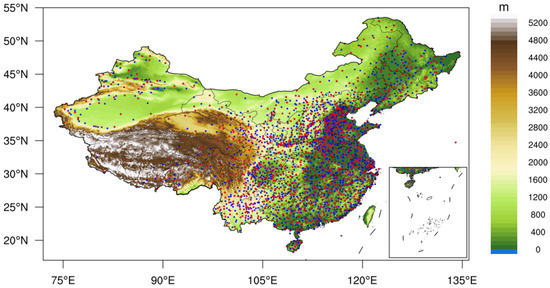 Geolocation of the stations used in this study over China. The sites of training and validation data for the near-surface air temperature (Ta) estimation model are marked in blue and red colors.