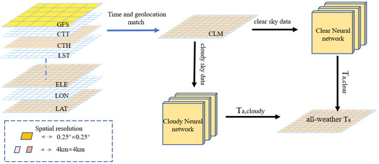 Figure 2 illustrates the flowchart for all-weather Ta estimation approach. In the process of Ta estimation, AGRI pixels were divided into clear and cloudy sky based on the CLM products. The clear and cloudy sky match-ups were input into the Ta,clear and Ta,cloudy NN estimation models, respectively. Next, the AGRI-derived Ta,clear and Ta,cloudy were combined to produce the Ta for all-weather conditions.