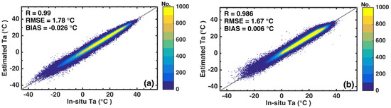 The estimated Ta of the two models became relatively discrete with in situ data when the Ta was lower than −20 °C. This means that the accuracy of the two models decreased slightly for low-Ta conditions, which might have been due to the fact that there were fewer samples at the boundary of the training data.