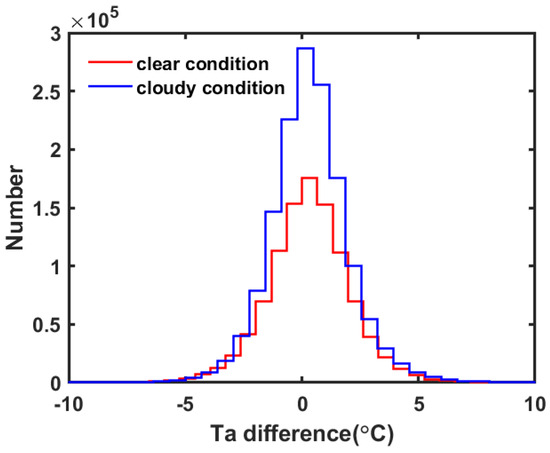 Figure 4 shows the Ta difference (AGRI Ta–in situ Ta) histograms for Ta,clear and Ta,cloudy. The errors of both models showed a normal distribution, and most of the Ta differences were within ±2.5 °C (i.e., >80.95% samples). The samples with Ta differences of less than 2.0 °C accounted for 72.04% and 74.88% of the total for clear and cloudy sky, while those with less than 1.5 °C accounted for 60.65% and 64.01%, respectively. Satellite-derived Tair is typically regarded as ‘accurate’ when its accuracy range lies between 1 and 2 °C [51]. This indicates that the proposed models can accurately estimate Ta,clear and Ta,cloudy in most scenarios.