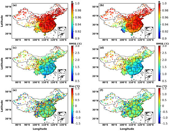 Spatial patterns of R (a,b), RMSE (c,d), and bias (e,f) for the AGRI-derived Ta,clear (left) and Ta,cloudy (right).