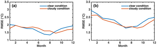 The monthly variation in RMSE for AGRI-derived (a) and GFS (b) Ta,clear and Ta,cloudy.