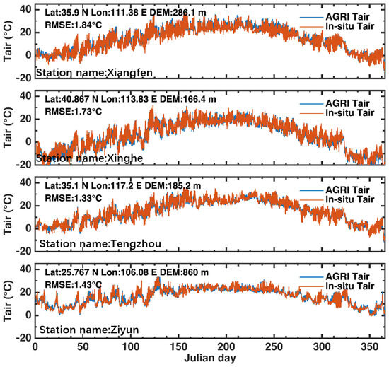 The temporal variations of the AGRI-estimated all-weather Ta versus the instantaneous Ta measurements at 3 h intervals at four meteorological stations (randomly selected) in 2020 are shown in Figure 7. The station’s latitude ranged from 25.6°N to 40.86°N, with the elevation ranging from 185.2 to 860.0 m. The Ta at these stations showed clear seasonal variation characteristics. The Ta values at these stations were higher during the summer and lower during the winter. The dynamic range of the Ta in summer was smaller than in other seasons. In general, the estimated Ta had a good agreement with the station data across different seasons for each site, with RMES values between 1.33 and 1.84 °C. The AGRI-estimated Ta could capture the seasonal and diurnal variation characteristics of air temperature. In addition, it was also shown that the Ta,clear and Ta,cloudy estimation models had good consistency.