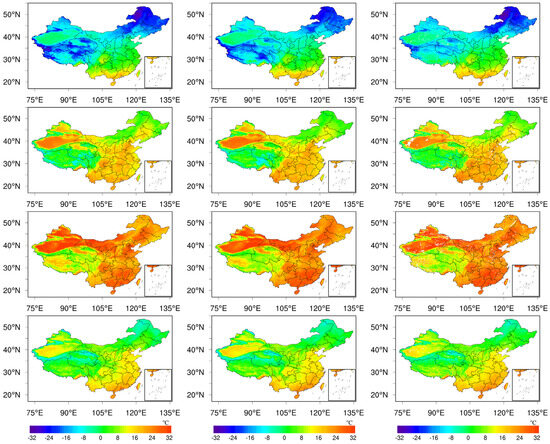 Comparison of the spatial pattern of GFS (first column), the ERA5−Land (second column) and AGRI-estimated all−weather Ta (third column) at 12:00 UTC on 15 January, April, July, and October 2020.