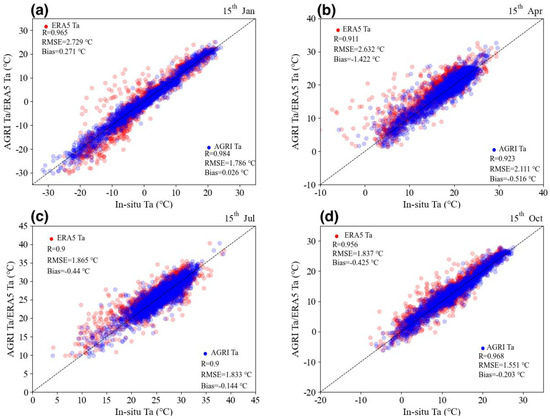 Comparisons of ERA5−Land and AGRI Ta with in situ Ta at 12:00 UTC, 15 January (a), April (b), July (c), and October (d) 2020.