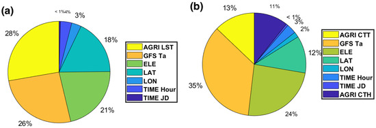 It is worth mentioning that the errors in the latitude, longitude, JD, and hour in the model are usually negligible, so their contributions are relatively stable. In contrast, the total sensitivity index of the AGRI and GFS data is more closely related to their precision. If the accuracy of GFS Ta is higher than that of AGRI LST, we believe that the contribution of GFS will be larger than that of AGRI LST for Ta estimation. At present, the contribution of the AGRI is slightly larger than that of the GFS Ta in the clear-sky model. In comparison, the contribution of the GFS Ta is larger than that of the AGRI in the cloudy-sky model, which may be related to the higher accuracy of GFS Ta in cloudy sky. With the improvement in the accuracy of AGRI and GFS products, their contributions will also be improved. It is necessary to improve the accuracy of satellites and GFS to obtain higher-precision Ta.