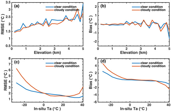 Dependence of the RMSE (a,c) and bias (b,d) of the AGRI Ta estimation models on elevation and Ta for clear and cloudy conditions.