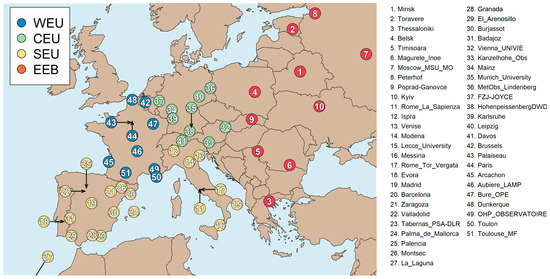 The stations were grouped into four regions: Southern Europe (SEU: Italy, Portugal, and Spain), Central Europe (CEU: Austria, Germany, and Switzerland), Eastern Europe and the Balkans (EEB: Belarus, Estonia, Greece, Poland, Romania, Russia, Slovakia, and Ukraine), and Western Europe (WEU: France and Belgium). This partitioning has nothing to do with historical or political geographies; it is a simple loose grouping of countries that are geographically close and have had a somewhat similar approach to the pandemic. The latter argument is the reason why, for example, Greece was included in the EEB group instead of the SEU. It was also considered that the regions have a balanced number of stations and data points. The study locations are color-coded according to the four regions in
