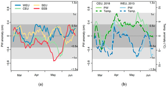 Figure 2. Namely, the low temperatures and PW levels associated with prolonged winter in 2013, and the high temperatures and PW associated with the 2018 heatwave.