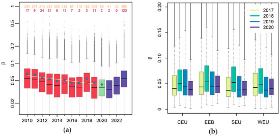 Therefore, we conclude that there is no statistically significant variation for the 2020 values. Both the average values and the frequency of high pollution episodes for 2020 are consistent with the multiannual decreasing trend. In the right panel, we see the breakdown of β per region for the years 2017–2020. It is interesting to note how different the interpretation of the 2020 values is if we look only at the last 2–3 years. For CEU locations, 2020 seems to fall within the decreasing trend, for example, while at the EEB locations, 2020 seems to break with the increasing trend. However, in the bigger picture, the values are all consistent with the long-term decreasing trend.