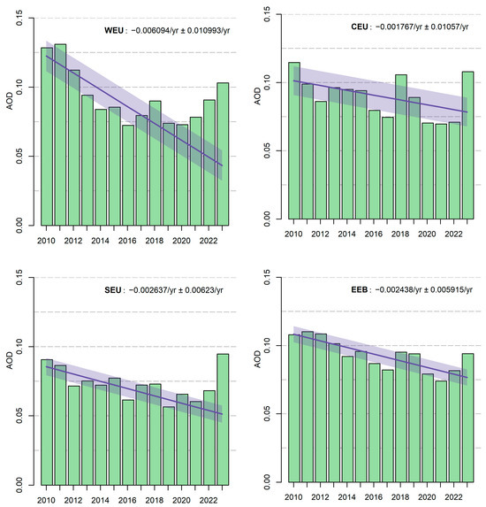 Figure 4 for each region. A one-standard-deviation band is also shown, which helps with the visual identification of outlier years. The situation is different for different regions. The WEU locations show the fastest reduction in aerosol levels with a slope of −0.0061/yr; however, the trend is distorted partly by very high AOD values during 2010–2012. The SEU and EEB locations experience a milder decreasing trend, with slope equal to −0.0026/yr and −0.0024/yr. The CEU region is peculiar, having a very small slope of −0.0019/yr but with high volatility; the standard deviation of residuals is equal to 0.01065. However, some universal results were found across all four regions: