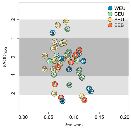 Figure 5. We observe that for most stations, the 2020 AOD falls within one standard deviation of the decreasing linear trend. Taking into account the working hypothesis in this study, 10/51 stations fall more than one standard deviation, and 4/51 stations fall more than two standard deviations below the trend. The stations with the most extreme anomalies for the pandemic year 2020 are, in order: Modena, Italy; Poprad-Ganovce, Slovakia; Belsk, Poland, and Toulon, France. Locations do not cluster geographically or regionally. Among the stations with the largest relative reductions for 2020 are both stations that experience relatively high average yearly AOD (~0.12) and stations with a lower mean AOD (~0.07).
