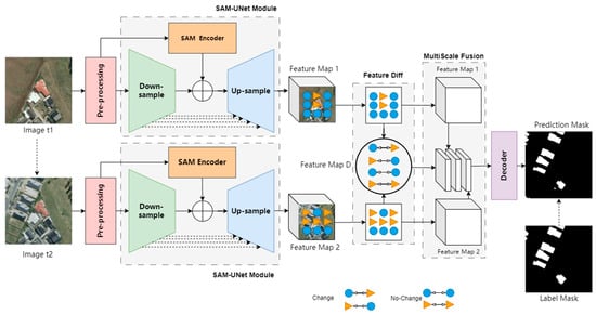The SCDM framework designed in this study is illustrated in Figure 3 and consisted of several modules, including preprocessing, SAM-UNet feature extraction, feature difference comparison, multi-scale feature fusion, and a decoder. The following sections will provide a detailed introduction to the image change detection model framework that integrates SAM and UNet, organized according to the sequence of connections among the modules.