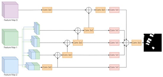 To enhance the accuracy and robustness of building change detection tasks under varying conditions, this study designed and implemented a multi-scale feature fusion module specifically for integrating global feature maps from different time points with difference features. As shown in Figure 4, the global feature maps each undergo a process of four levels of down-sampling and four levels of up-sampling, facilitated by a Feature Pyramid Network (FPN) architecture. This structure not only elevates the diversity of feature scales but also ensures comprehensiveness and depth of information.