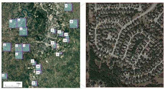 The WHU-CD dataset [] is a remote sensing image change detection dataset created by the Sensing Intelligence, Geoscience, and Machine Learning Lab (SIGMA) at Wuhan University, introduced by Liu et al. []. This dataset comprises a pair of aerial images captured in the same area at two time points in 2012 and 2016. The image dimensions are 32,507 × 15,354 pixels with a spatial resolution of 0.075 m/pixel. It annotates the changes in buildings, and the spatial distribution of geographic elements along with images from different viewpoints are depicted in Figure 7 and Figure 8, respectively.