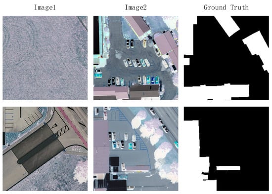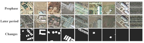 The LEVIR-CD [] is a large-scale remote sensing dataset for building change detection, as illustrated in Figure 5. It comprises 637 pairs of very-high-resolution (VHR, 0.5 m/pixel) Google Earth image patches, each with a size of 1024 × 1024 pixels. These dual-temporal images span a time interval of 5 to 14 years, depicting significant land use changes, particularly in building growth.