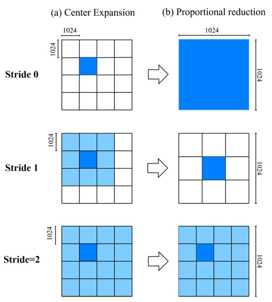 For the comparison dataset of high-resolution remote sensing images D, this study adopts a center dilation contraction method for image segmentation. The detailed procedure of the center dilation contraction method, utilized in the method of fine-grained high-resolution remote sensing image change detection involving the fusion of the SAM, is depicted in Figure 9. Here, x and y represent the positions of the central cell, with stride indicating the dilation step based on the coordinate (x, y).