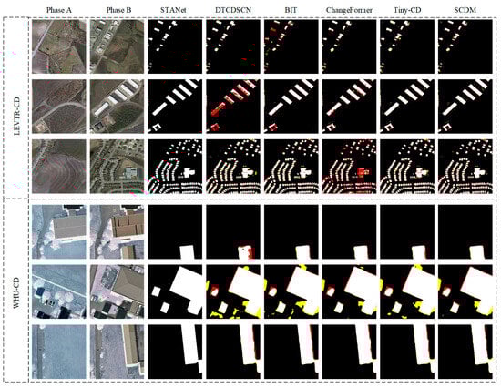 The visualization results of the LEVIR-CD and WHU-CD datasets (where whie, yellow, and red denote correctly detected, erroneously detected, and unidentified instances, respectively).
