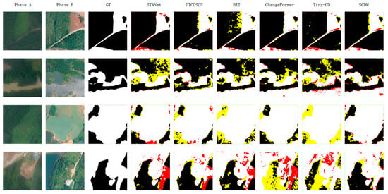 On this dataset, the SCDM achieved optimal values in both (R) and Intersection over Union () metrics, with scores of 88.56% and 82.23%, respectively. This indicates that the SCDM exhibits high sensitivity in identifying changed areas and performs exceptionally well in predicting the overlap between detected changes and actual changes. The model achieved an accuracy () of 84.68%. Although its () is slightly lower than that of ChangerEx and its score is marginally lower than that of Tiny-CD, the SCDM maintains a superior overall performance.