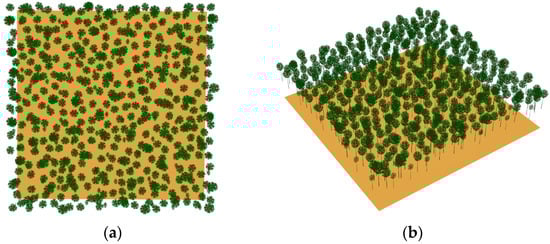 Visualization scene of three-dimensional forest stands using the LESS model, vertical view (a) and aerial view (b).