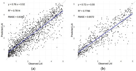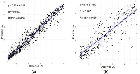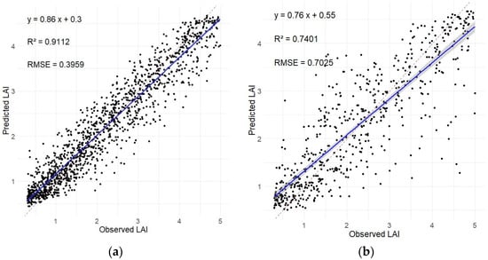 Training set (a) and testing set (b) of the Leaf Area Index (LAI) employing the XGBoost model. RMSE, root mean squared error.
