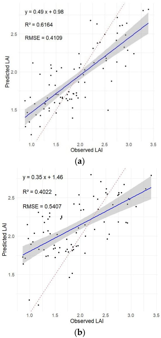 Training set (a) and testing set (b) of the Leaf Area Index (LAI) using the Random Forest model. RMSE, root mean squared error.