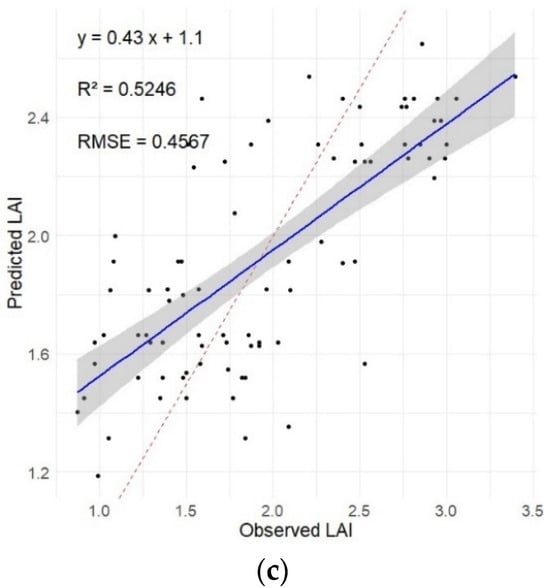 Validation set of Leaf Area Index (LAI) utilizing the Random Forest (a), BP Neural Network (b), and XGBoost (c) algorithms. RMSE, root mean squared error.