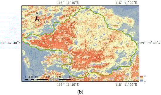 Based on the aforementioned model validation results, we selected the Random Forest and XGBoost algorithms to perform LAI inversion and generated the corresponding LAI spatial distribution maps (Figure 8). We unified the range of its values in the layer display to [0, 3]. The LAI values predicted by the Random Forest inversion ranged from 0.4630 to 2.8349, while the LAI values predicted by XGBoost ranged from 0.4161 to 2.6496. Both tend to slightly underestimate the true value. In comparison, the inversion result of Random Forest is closer to the true value.