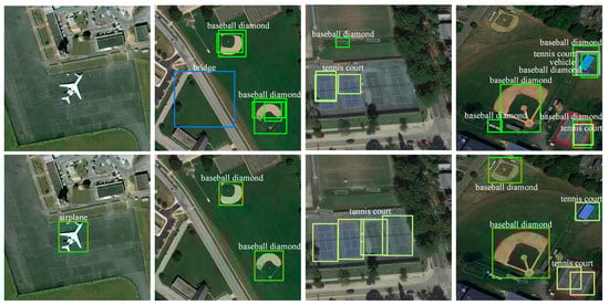 Few-shot learning emerges as a promising solution to counteract the issues of diminished accuracy and generalization stemming from limited data. In the context of few-shot object detection, data categories are typically divided into base classes and novel classes. Base classes represent non-few-shot categories, which have abundant training data available. In contrast, novel classes are the few-shot categories, where only a limited amount of training data are available. These novel classes are the primary focus of few-shot object detection, as they pose a significant challenge due to the scarcity of training examples. Few-shot object detection strives to harness minimal data from novel classes, enhancing detection capabilities for these classes [10]. Presently, the majority of few-shot object detection studies concentrate on natural scene datasets, such as VOC2007 [11], VOC2012 [12], and MS-COCO [13], with substantial successes recorded [14,15,16,17]. However, in the remote sensing domain, the adaptation of few-shot detection is still nascent. Generally speaking, remote sensing images typically exhibit intricate backgrounds [18], significant variations in target dimensions [19], substantial intraclass variance, and comparatively minor interclass variance [20]. The stylistic disparities between remote sensing and natural scene data mean that algorithms efficient in the latter might falter in the former. As illustrated in Figure 1, the top row displays detection outcomes from the Two-stage Fine-tuning Approach (TFA) [15], which is efficient in natural scenes, when applied to remote sensing datasets. In contrast, the bottom row presents results from the method introduced in this study for the identical test set. This visual comparison underscores the substantial performance variance of a single algorithm across different dataset types. Hence, it is imperative to delve into the realm of few-shot object detection algorithms that are tailored to cater to the intricacies of remote sensing images.