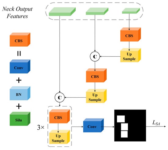 To address this, the proposed SA, depicted in Figure 3, seeks to bolster the model’s focus on the foreground entities. Firstly, it is imperative to acquire the labels pertinent to SA, as exemplified in Figure 4. By leveraging the bounding box labels utilized in object detection, we aim to derive segmentation label maps specifically targeting foreground objects. Crucially, during this meticulous process, we will meticulously ensure that the tally of segmented labels aligns precisely with the count of detected labels, thus ensuring the integrity and accuracy of our labeling exercise. Once training data traverse the backbone and neck, feature maps of three distinct scales emerge. By leveraging convolutional blocks and up-sampling, the feature maps from a given layer are integrated with those from the subsequent layer, facilitating a comprehensive fusion. Subsequent to this fusion, the unified feature map undergoes successive convolution and up-sampling processes. The culmination of this process is a binary prediction map of the foreground target, derived from a convolution with a 3-sized kernel. The disparity between this predicted binary map and its corresponding label gives rise to a loss, denoted as . This loss metric is computed using the cross-entropy loss function, as detailed in the subsequent equation: