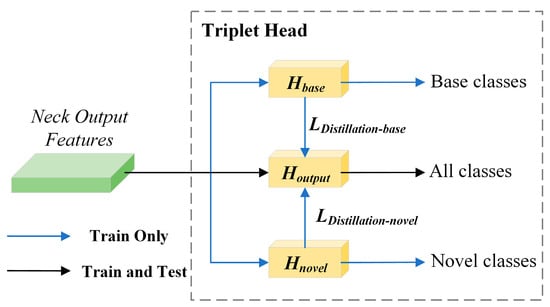 The concept of knowledge distillation, originally introduced by Hinton et al. [50], leverages intricate teacher networks to supervise and guide the learning process of simpler student networks. The results obtained from teacher networks training are extracted to guide the results of student networks, thereby enabling students to learn better online. In order to alleviate the problem of forgetting base-class knowledge, we propose a Tri-Head and use a dual-path distillation method, as shown in Figure 5.