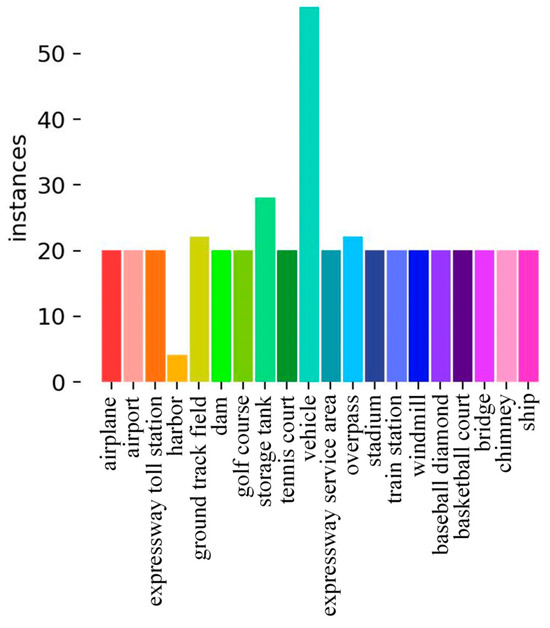 It is worth noting that, given the issue of Incompletely Annotated Novel Objects mentioned by Zhang et al. [24], and in order to maintain the detection performance of base classes, we did not restrict the number of training samples for base classes. Instead, we utilized all base-class samples and few-shot novel-class samples in the training images. As shown in Figure 6, under the 20-shot setting of the DIOR dataset, the number of base-class samples may be higher or lower than 20, but the maximum number of novel-class samples is 20. The first 15 classes in the figure belong to base classes, while the last 5 classes belong to novel classes.
