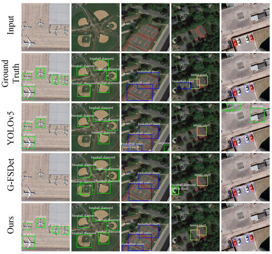 Visualization of detection results of our method versus YOLOv5 and G-FSDet on the DIOR dataset under the 10-shot setting in Split1.