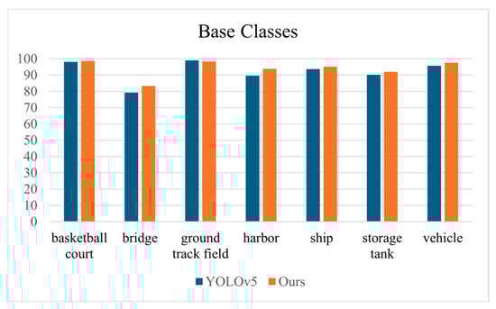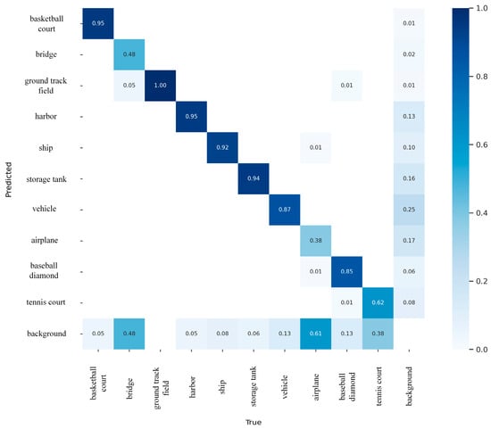 To further demonstrate the effectiveness of our method, we listed the detection results of each category in base classes and novel classes on the NWPUv2 dataset under the 3-shot setting, as shown in Figure 8 and Figure 9, respectively. We compared them with baseline YOLOv5. The confusion matrix depicted in Figure 10 serves as a visual representation of the probabilities associated with the correct and incorrect classifications of each category. The background class itself does not belong to a category in the dataset. In the confusion matrix, the background class is used to indicate how many targets are mistakenly detected as background (missed detections) or how much background is mistakenly detected as targets (false detections). Along the horizontal axis, the actual category is indicated, while the vertical axis signifies the predicted category. Upon examining the matrix, it becomes evident that within the base classes, the ‘bridge’ category exhibits a comparatively higher probability for misclassification. Similarly, among the novel classes, the ‘airplane’ and ‘tennis court’ categories also demonstrate a notable probability of being misclassified. We designated these samples, which pose a challenge in accurate classification, as difficult samples. As observed in Figure 8 and Figure 9, our proposed method demonstrated notable advancements in addressing the classification of difficult samples, exhibiting a distinct improvement over the baseline.
