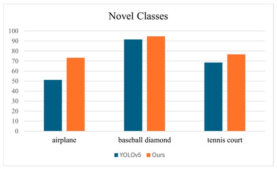 In Table 4, upon introducing the addition of , base-class performance and novel-class performance on the NWPUv2 dataset exhibited increments of 1.22% and 1.99%, respectively. In contrast, Table 5 reveals a marginal 0.03% decrement in base-class performance of the DIOR dataset, whereas novel-class performance experienced a significant improvement of 6.99%. Overall, can effectively improve the detection ability of novel classes while maintaining the performance improvement or slight decrease in the base classes. This is attributable to the assistance of in classification tasks, particularly in handling objects that are challenging to classify.