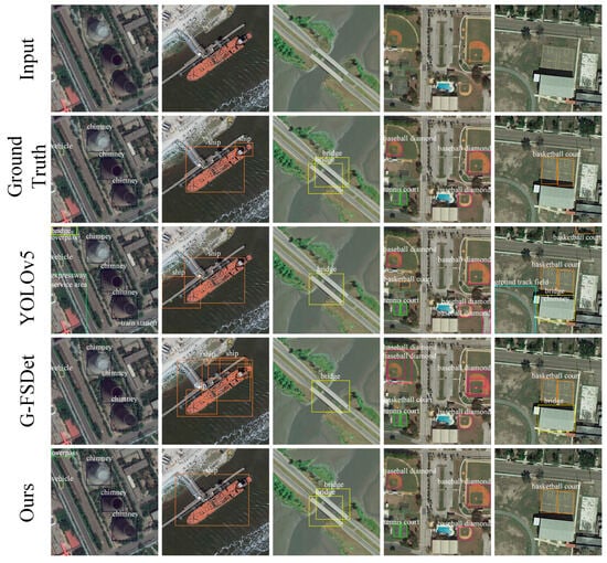Figure 11 presents the visual outcomes of the proposed approach, G-FSDet and YOLOv5, on the DIOR dataset under the 10-shot setting in Split1. The few-shot categories in Split1 are baseball diamond, basketball court, bridge, chimney, and ship. In the third row, examining the results of YOLOv5 reveals a significant number of false detections. In the fourth row, G-FSDet also experienced some erroneous detections. However, in the last row, our proposed method’s detection results demonstrate a substantial improvement in reducing these false detections.
